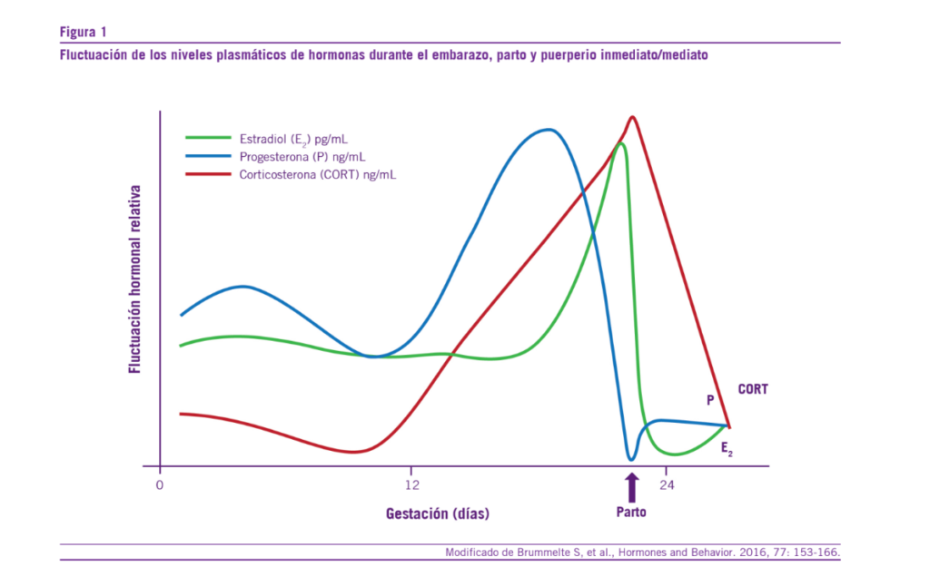 El embarazo es una etapa de grandes cambios en el cuerpo y la mente de la mujer, tiene una duración de 40 semanas, pero existe una gran variabilidad de la extensión que oscila entre las 38 y las 42 semanas (6, 7). Al principio, la mujer embarazada presenta varios síntomas producto de los cambios hormonales, tales como náuseas, vómitos, mareos, micción frecuente, amenorrea, sueño frecuente. Estos cambios son los que permitirán que se generen los procesos necesarios en el cuerpo de la mujer para gestar una nueva vida (6-9). Existe una serie de cambios hormonales en la mujer que abarcan tanto el embarazo como el parto y el puerperio inmediato y mediato. La figura 1 resume estos cambios plasmáticos hor- monales (principalmente estradiol, progesterona y cortisol) (10, 11) (Ver Figura 1).