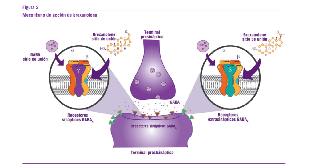 La brexanolona es un esteroide neuroactivo, de pequeño tamaño molecular y actúa como un modulador alostérico po- sitivo del receptor GABA-A sináptico y extra sináptico (30-35) (Ver Figura 2).