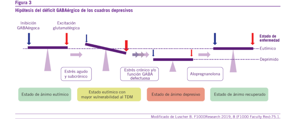 GABA sobre su receptor (alterando la frecuencia y duración de apertura del canal de cloro) y cuando se encuentra en altas concentraciones puede activar directamente el receptor GA- BA-A. Como consecuencia de la interacción con el receptor GABA, se incrementa la inhibición neuronal, con la conse- cuente acción ansiolítica y sedativa. En forma adicional, la alopregnanolona produce una potenciación de la liberación de