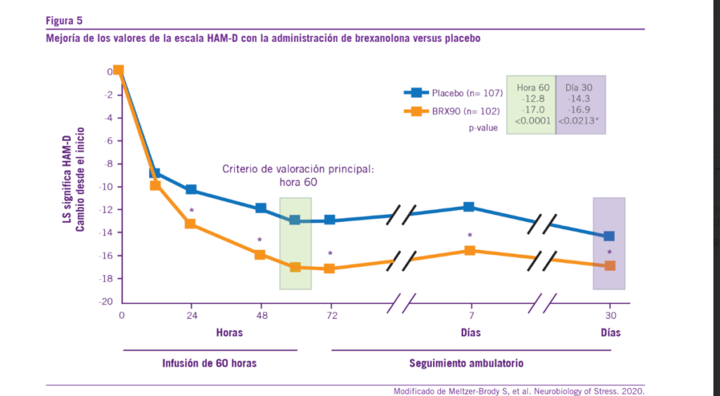 También se ha evidenciado una significativa disminución de la sintomatología depresiva en pacientes con DPP con la administración de 90 µg/kg/h de brexanolona, más allá del antidepresivo utilizado hasta ese momento (sertralina, bupro- pión). Esta mejoría sintomática se reflejaba en una reducción significativa (p=0.028) a las 60 horas de infusión de brexa- nolona en los valores de la escala HAM (Escala de Depre- sión y Ansiedad de Hamilton). El efecto terapéutico sostenido (durante al menos 1 mes posterior a la única administración endovenosa) es una arista que le brinda a esta molécula una importancia destacada dentro del arsenal terapéutico actual de la depresión postparto (42-44).