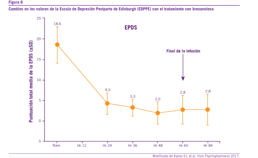 diversos estudios clínicos se observó que a las 24 horas de la administración de brexanolona las pacientes presentaban una significativa mejoría de la sintomatología depresiva Esta mejoría sintomática se sostenía, inclusive, hasta el séptimo día post-administración del fármaco. Esta rapidez de acción antidepresiva de la brexanolona favorece la recuperación en breve tiempo de las pacientes depresivas, reduciendo el riesgo de autolesiones y el riesgo para el propio bebé, como con- secuencia de la falta de atención o interacción/cuidados por parte de la madre (42-44).