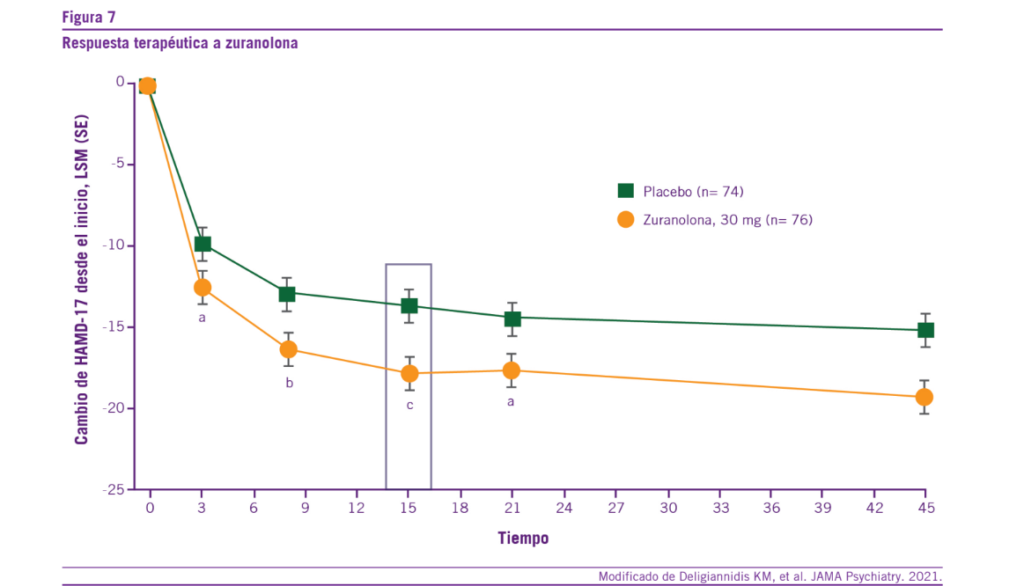 La zuranolona también actúa como un modulador alostérico positivo de los receptores GABA-A. Presenta un perfil farma- cocinético y de metabolismo mejorado en comparación con la brexanolona (menor clearance con la consecuente mayor biodisponibilidad por vía oral, que permite una administra- ción más cómoda) (46-48). En diversos trabajos científicos, zuranolona demostró mejorar significativamente los síntomas depresivos en las mujeres que presentaban DPP. Cabe desta- car su rapidez de acción terapéutica y su efecto terapéutico sostenida hasta los 45 días del comienzo del tratamiento far- macológico (Ver Figura 7) (47).