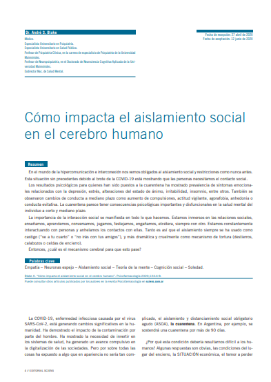 Jun 12, 2020 Biblioteca Dr. André S. Cómo impacta el aislamiento social en el cerebro humano Resumen En el mundo.. Read more