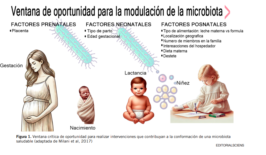 ocurre en los llamados “1.000 días”, que van desde la concepción hasta los primeros 2 años de vida del niño, éste período se considera una ventana crítica de oportunidad para realizar intervenciones que contribuyan a la conformación de una microbiota saludable [8] (Figura 1).