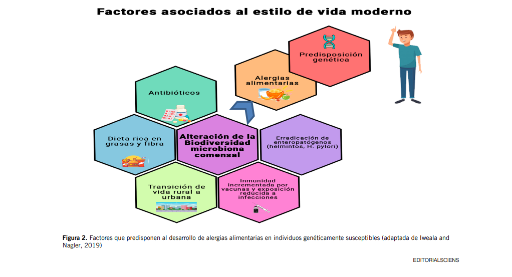 En la figura 2 se muestra cuáles son los factores que predisponen al desarrollo de alergias alimentarias en individuos genéticamente susceptibles.