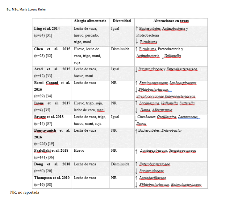 En la tabla I se mencionan los estudios publicados hasta la fecha en alergias alimentarias mediadas por IgE. Los estudios muestran resultados dispares, si bien parecería existir un aumento de Enterobacteriaceae y Bacteroides, y disminución de bifidobacterias en varios de ellos.