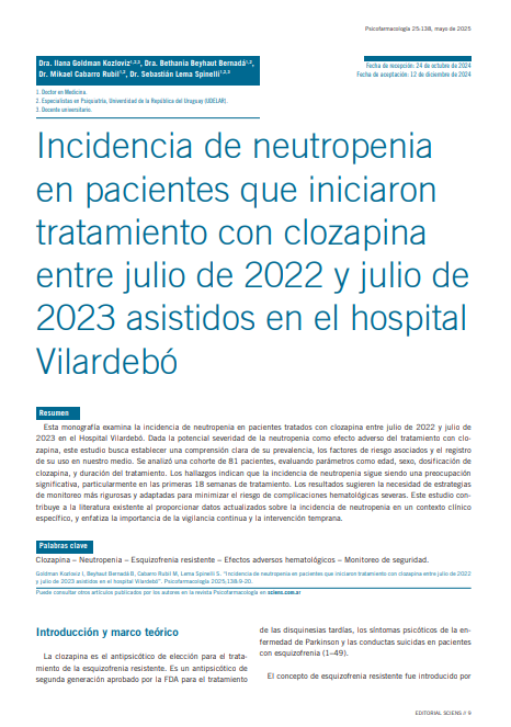 Dic 12, 2024 Biblioteca Dra. Ilana Goldman Kozloviz, Dra. Bethania Beyhaut Bernadá Dr. Mikael Cabarro Rubil , Dr. Sebastián Lema Spinelli Introducción y marco teórico La clozapina es el antipsicótico de elección para el tratamiento.. Read more