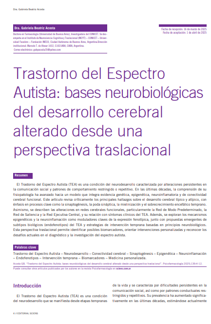Sep 29, 2025 Psicofarmacología y Neurociencias Dra. Gabriela Acosta El Trastorno del Espectro Autista (TEA) es una condición del neurodesarrollo caracterizada por alteraciones persistentes en la comunicación social y patrones de comportamiento restringido o repetitivo. En las últimas.. Read more