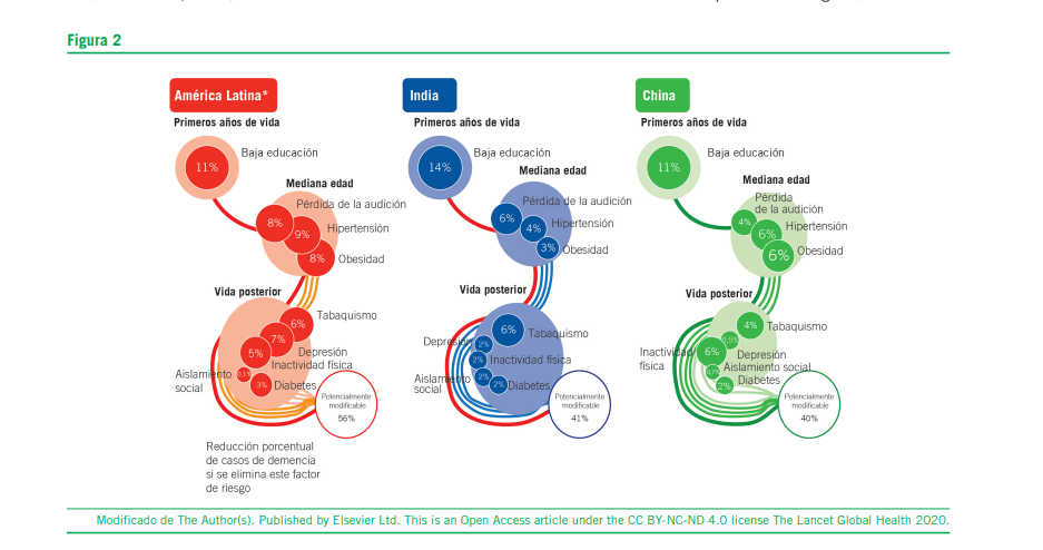 En el año 2020 se publicó un artículo muy interesante en Lancet en el cual se daba cuenta de los factores de riesgo (FR) más importantes para demencia. Lo interesante de esta publicación es que los FR modificables, a nivel global, eran de un 40% versus un 60% de los no modificables. Un dato de sumo interés para nuestra región (Latinoamérica) es que los FR modificables se elevaban a un 56%.