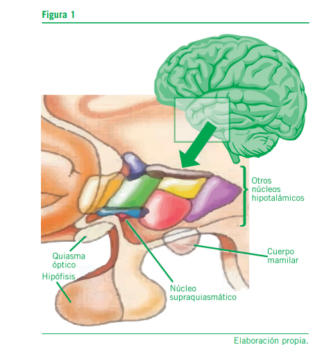 En el zona anterior del hipotálamo se encuentran los cen- tros reguladores del sueño y del ritmo circadiano. Otras regio- nes del sistema nervioso involucradas son el sistema reticular activador ascendente, el núcleo supraquiasmático (es consi- derado el reloj endógeno principal que regula estos ritmos), la protuberancia anular y la glándula pineal (Fuller P, et al., 2006).