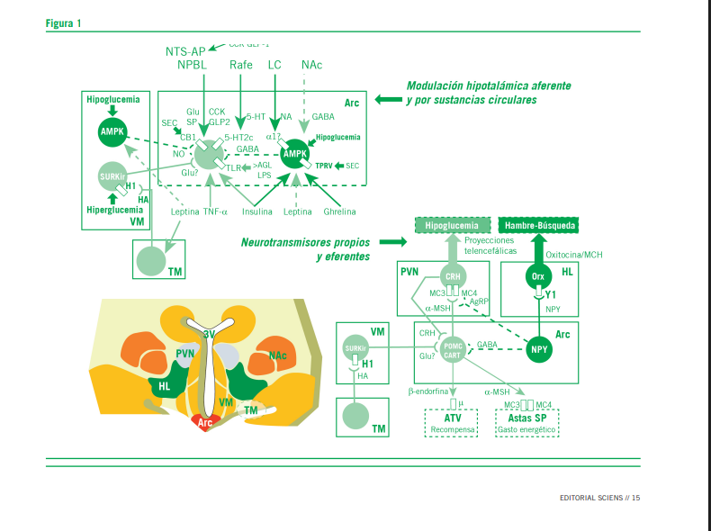Diferentes estudios han vinculado el antagonismo-agonismo inverso de distintos neuro y psicofármacos sobre receptores hipotalámicos H1 y 5-HT2c con su capacidad inductora de síndrome metabólico. Tanto las pocas neuronas histaminérgi- cas túbero-mamilares como las serotonérgicas del rafe proyectan sus fibras axonales por todo del SNC pues participan en varias funciones homeostáticas y cognitivas. De acuerdo con la figura 1 ambos sistemas producen anorexia ya que, directa o indirectamente, estimulan las neuronas POMC/CART del núcleo arcuato (Arc) o inhiben las orexinérgicas del núcleo paraventricular (PVN) y empleando los receptores mencionados. Para los receptores H1, cuanto mayor es la afinidad antago- nista de la droga usada (menor pA2) mayor es el efecto orexígeno que aparece durante el tratamiento crónico (superior a las 4-6 semanas), esto se comprueba para los antipsicóticos,