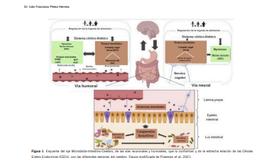 El TGI (Tracto Gastrointestinal) y el cerebro interactúan de forma compleja y bidireccional utilizando la circulación sanguínea y los nervios craneales como canales de comunicación (figura 1). En este proceso, las hormonas liberadas por las células enteroendócrinas (EEC) estimulan el cerebro a través de la vía humoral o neural, y los enterocitos actúan como sensores del contenido luminal, liberando diferentes combinaciones de hormonas intestinales, que actúan sinérgicamente para detener la ingesta de alimentos y producir saciedad a través de la señalización endocrina y nerviosa. Dentro de las hormonasintestinales se incluyen Colecistoquinina (CKK), péptido similar al glucagón 1 (GLP- 1), péptido YY (PYY), oxitomodulina (OXM), y péptidos inmunogénicos del gluten (GIP) los cuales llegan al cerebro (camino aferente) y generan señales centrales (vía aferente) que transmiten impulsos periféricos que causan un efecto (vía eferente) anorexígeno.
