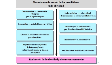 Algunos mecanismos sugeridos mediante los cuales los probióticos mejoran la salud intestinal y reducen los trastornos metabólicos relacionados con la obesidad son los siguientes (figura 2):