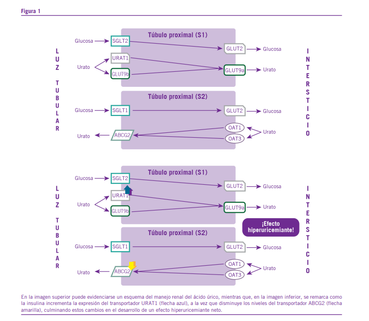 Por otro lado, gracias a su efecto de disminución del peso corporal, el cual se asocia a un descenso en la resistencia a la insulina, estas drogas también se- rían capaces de aumentar la excreción a nivel renal de ácido úrico, al modificar los patrones de expresión de moléculas como URAT1 y ABCG2, cuya expresión se haya vinculada a los niveles de insulina presentes en el organismo.