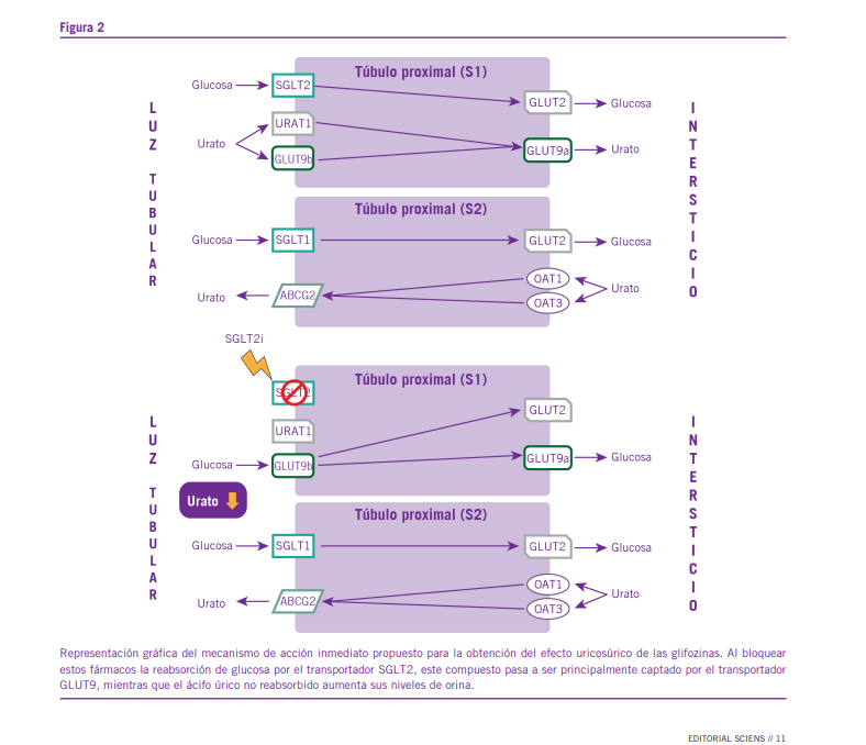 En un primer momento, los inhibidores de SGLT2, al provocar un aumento en la oferta de glucosa a nivel luminal en los túbulos proximales, llevarían a esta última a competir con el ácido úrico por su reabsorción renal mediada por una molécula clave: el transportador GLUT9.