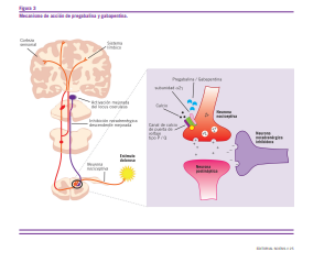 Uno de los grupos terapéuticos con mayor aval científico en diversas guías de tratamiento internacionales son los ga- bapentinoides (pregabalina, gabapentin). La pregabalina, fár- maco antiepiléptico, se destaca por tener una potente acción analgésica, ansiolítica y anticonvulsivante. Posee una estruc- tura química similar al GABA, pero carece de efectos sobre los receptores de dicho neurotransmisor inhibitorio. Asimismo, tampoco parece imitar a nivel fisiológico el rol de GABA en el organismo humano. El mecanismo de acción de pregabalina se basa en la unión a la subunidad a2g del canal de calcio de las neuronas presinápticas. Como consecuencia, hay un menor número de canales expuestos para ser activados por los potenciales de acción. Esto genera una reducción de la entra- da de calcio, una menor liberación de glutamato y sustancia P y una reducción en la excitabilidad celular postsináptica en la vía espinotalámica.
