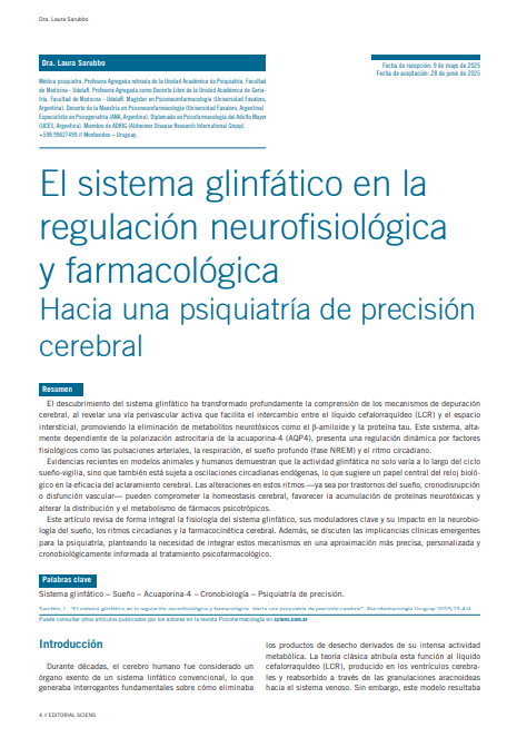 Sarubbo, L. “El sistema glinfático en la regulación neurofisiológica y farmacológica. Hacia una psiquiatría de precisión cerebral”. Psicofarmacología Uruguay 2025;27:4-9. Puede consultar otros artículos publicados por los autores en la revista Psicofarmacología en sciens.com.ar
