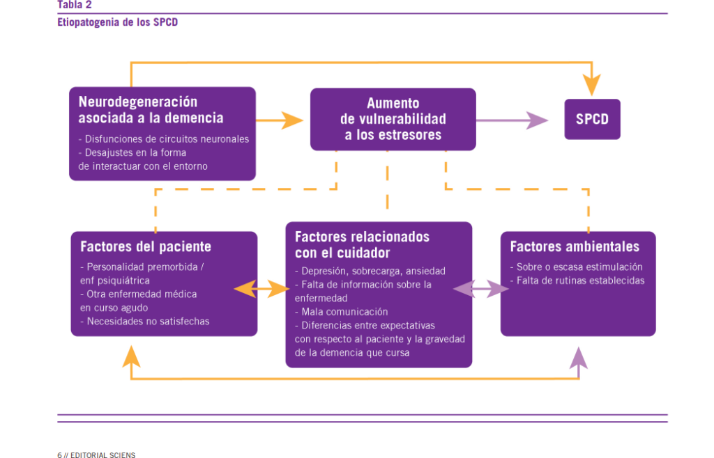 Su etiopatogenia es el resultado de la conjunción de múltiples procesos biopsicosociales en los que se incluyen procesos neurobiológicos secundarios a factores farmacológicos, traumáticos, mecanismos neuro inflamatorios, hipo metabolismo de algunos sectores corticales, causas genéticas, lesiones vasculares, etcétera. También influyen los ambientales; en este sentido se ha planteado que los SPCD pueden relacionarse y responder a factores estresantes ambientales en los que se incluyen aquellos que dependen del cuidador (Tabla2). Estamos ante una repuesta psico comportamental de estas personas al estrés, las que tendrían una vulnerabilidad incrementada a estos factores, ya que a medida que pasa el tiempo se necesita menor intensidad de ellos para que aparezca la sintomatología.