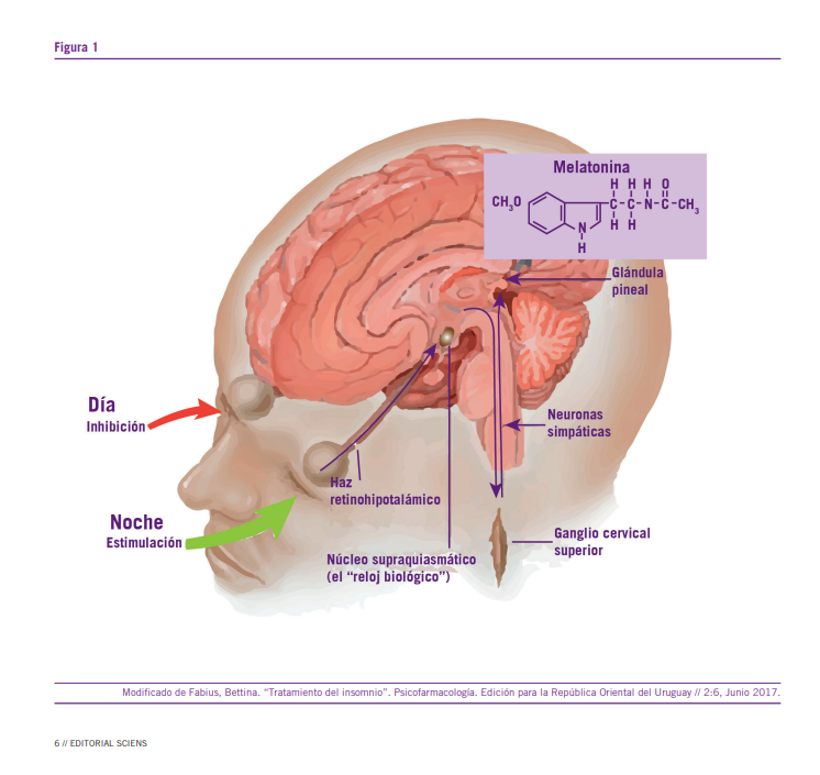 La luz a través de la retina y vía núcleos supraquiasmáticos inhibe la liberación de melatonina de la glándula pineal durante el día. Lo opuesto ocurre durante la noche en que se libera esta hormona. La luz bloquea nuevamente esta vía por neuronas glutaminérgicas. La melatonina induce el sueño a través de este mecanismo luz oscuridad, es decir, del ritmo circadiano, y es principalmente cuando existen circunstancias como la edad, cambios de uso horario, actividad laboral nocturna donde el uso de melatonina tiene su mayor beneficio especialmente en preparaciones de liberación prolongada.