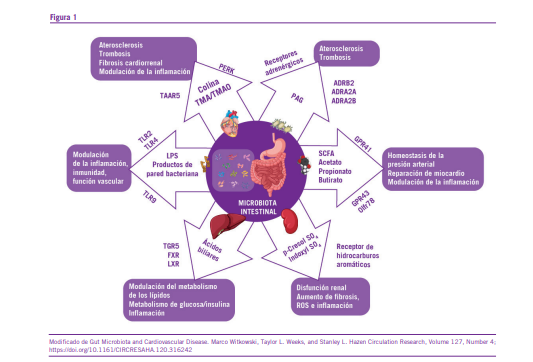 lismo lipídico y glucémico, modular la inflamación y mejorar la función endotelial. Por otro, compuestos como el TMAO y los lipopolisacáridos están estrechamente relacionados con inflamación crónica, estrés oxidativo, disfunción endotelial y aterosclerosis, subrayando el impacto negativo que tiene la disbiosis intestinal en la salud cardiovascular.