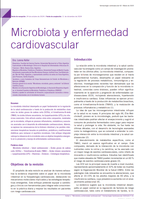 La microbiota intestinal desempeña un papel fundamental en la regulación de la salud cardiovascular a través de la producción de metabolitos clave como los ácidos grasos de cadena corta (SCFAs), el trimetilamina-N-óxido (TMAO), los ácidos biliares secundarios, los lipopolisacáridos (LPS) y las vita- minas esenciales. Este artículo analiza cómo estos compuestos, modulados por la microbiota, influyen en procesos inflamatorios, metabólicos y vascula- res asociados con el desarrollo de enfermedades cardiovasculares. Además, se exploran las consecuencias de la disbiosis intestinal y las posibles inter- venciones terapéuticas basadas en prebióticos, probióticos y modificaciones dietéticas para restaurar el equilibrio microbiano. Este enfoque integrador subraya la relevancia de la microbiota como un objetivo terapéutico emergen- te en la prevención y manejo de enfermedades cardiovasculares..