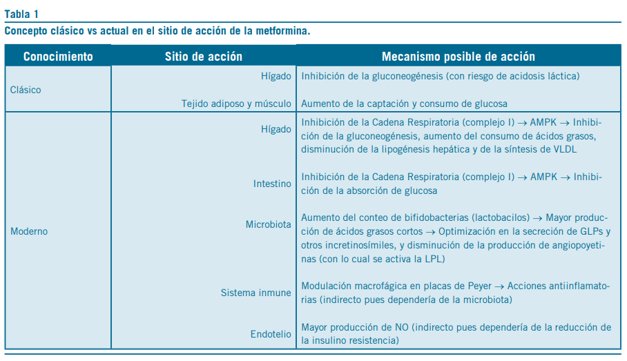 Se ha revisado el mecanismo de acción y las acciones farmacológicas de la metformina. Podemos concluir que existe consenso en que, además del conocido efecto en los hepatocitos, la modulación de la captación de glucosa en los enterocitos, los efectos incretino-símiles, y los efectos en la microbiota, explicarían los beneficios metabólicos de la metformina (así como los potenciales efectos adversos). Si bien el potencial efecto en las patologías metabólicas más allá de la diabetes es evidente, el beneficio sería marginal, limitado por su propio mecanismo de acción y potenciales efectos adversos.