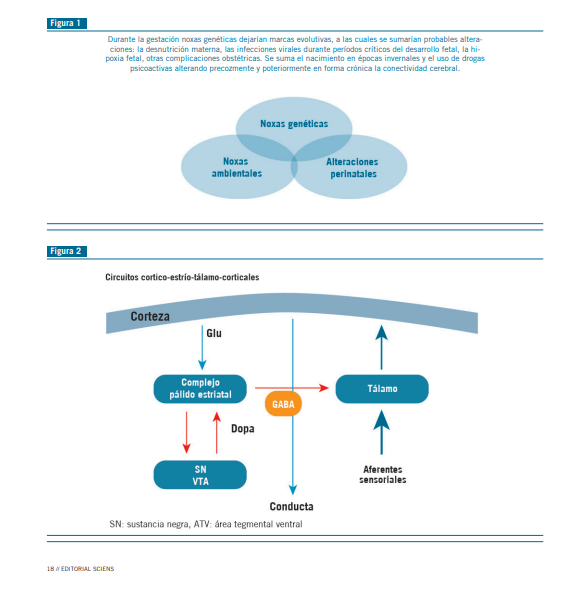 Habría menos Glu hacia el complejo pálido-estriatal y, por lo tanto, hay menos GABA hacia el tálamo. Esto determina que haya una mayor llegada de las aferencias sensoriales glutamatérgicas hacia la corteza, por falla del equilibro en el filtro talámico, determinada por la menor llegada de GABA, produciéndose una alteración en la conducta (Figura 4).