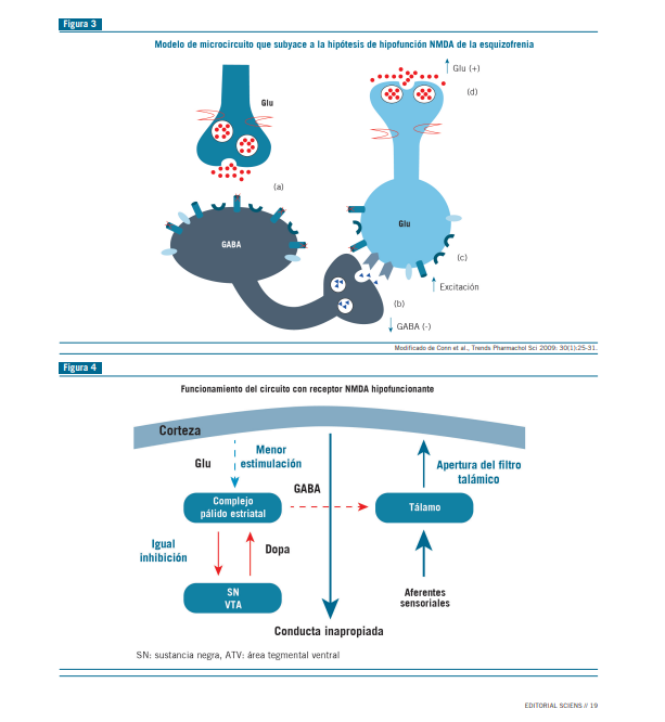 Los canales NMDA funcionan como “sensores” de la ac- tividad de las células piramidales y la ejercen a través de la GAD67 y la parvalbúmina de las interneuronas GABAérgicas. Si el sensor funciona mal, la interneurona sintetiza menos GABA y parvalbúmina en un intento de llevar la actividad de la célula piramidal a su nivel correcto, que en este contexto, resulta mal adaptativa, generando una sobreactividad de las células piramidales con aumento de la síntesis y liberación de glutamato, que determinaría el síndrome esquizofrénico (2) (Figura 3).