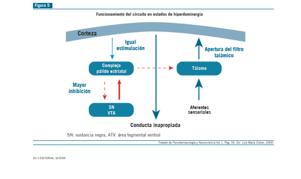 La hiperdopaminergia mesolímbica inhibe a las interneu- ronas, determinando que haya menos GABA hacia el tálamo, produciéndose un desequilibrio a favor de las aferencias sen- soriales glutamatérgicas, con apertura del filtro talámico, oca- sionado una conducta inapropiada.