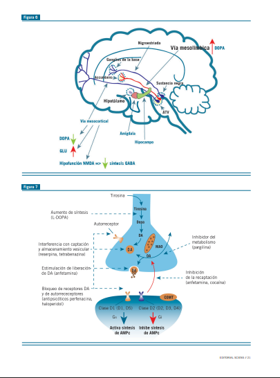 Existiría una hiperdopaminergia en la vía mesolímbica de los esquizofrénicos, responsable de las alucinaciones y delirios y una hipodopaminergia mesocortical responsable de la sinto- matología negativa y cognitiva, afectando en este último caso la working memory (habilidad para mantener transitoriamente en orden el material cognitivo, para guiarlo o conducirlo a una respuesta posterior) así como el alerta, vigilancia, aprendizaje verbal y no verbal (visual) y el razonamiento (Figura 6).
