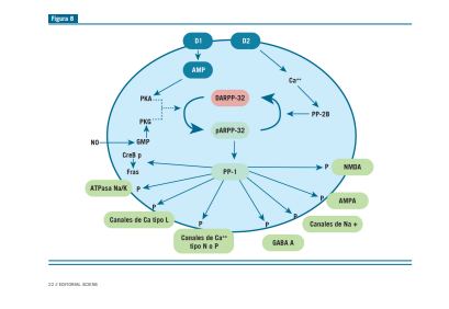 En estado fosforilado, pero no en el desfoforilado, la DAR- PP-32 inhibe a la mayor serina/treonina protein fosfatasa 1 (PP1). A través de esta inhibición, la DARPP-32 controla el estado de fosforilación y de actividad fisiológica de distintas proteínas, canales de Na+ voltaje dependiente, canales de Ca++ voltaje dependiente tipo L, P y N, la bomba de Na+/K+ ATPasa dependiente, el receptor NMDA tipo NR1, el receptor AMPA, el receptor GABA A y los factores de transcripción CREB p-fras (4).