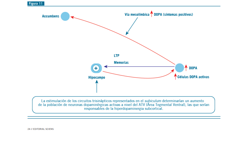 A esto se suma que la estimulación de los circuitos trisináp- ticos representados en el subiculum determinarían un aumen- to de la población de neuronas dopaminérgicas activas a nivel del ATV (área tegmental ventral), las que serían responsables de la hiperdopaminergia subcortical (esto se demuestra inac- tivando el subiculum), lo que indica que la región hipocampal es necesaria para producir el estado hiperdopaminérgico, en especial, la ideación delirante en psicosis esquizofrénicas y