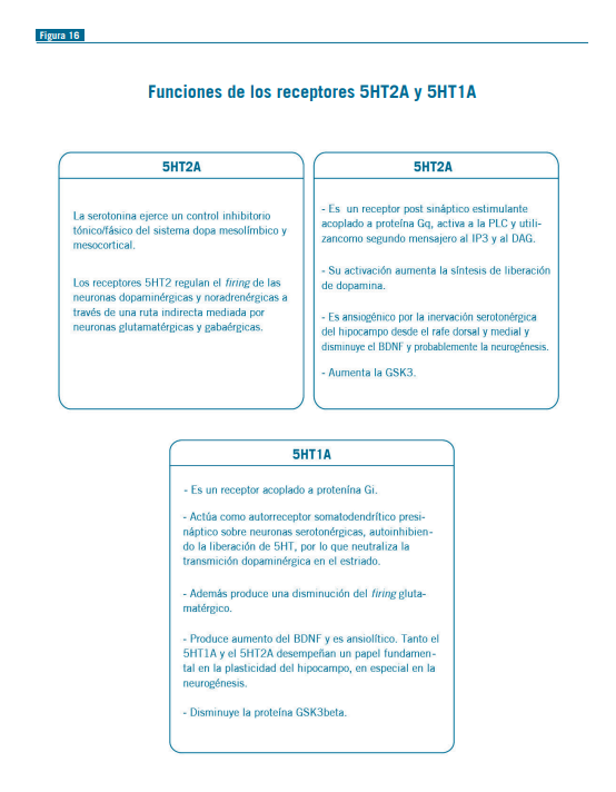 Con respecto a la acción de la serotonina, en la esquizofre- nia habría una interacción molecular entre el receptor 5HT2 y el mGluR2. Ambos receptores están acoplados a proteínas