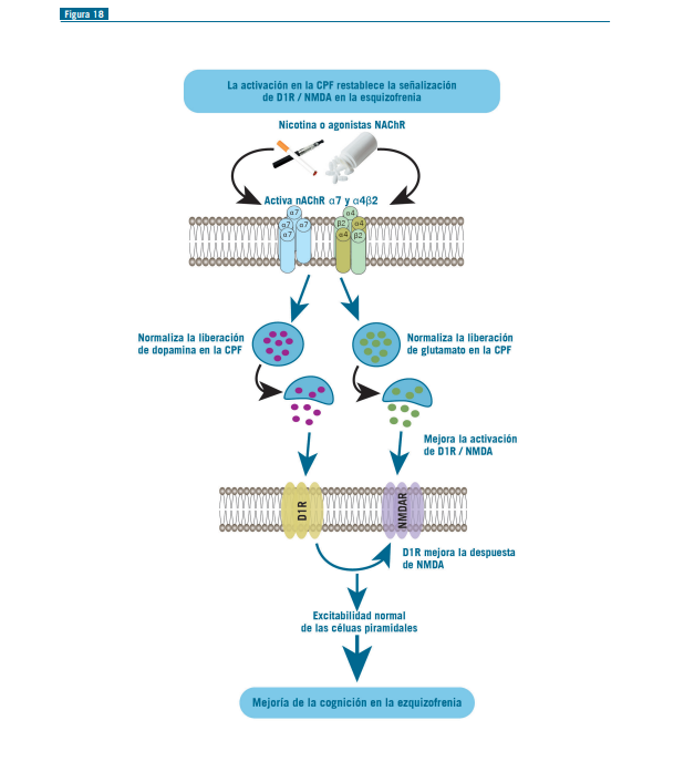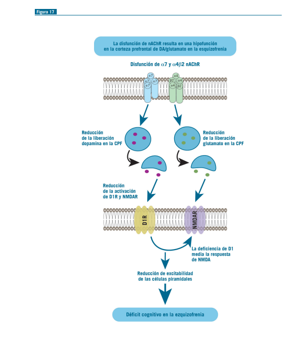 Los receptores nicotínicos de tipo a7 (pentámero homomérico) se concentran en las interneuronas, pueden despolarizarlas y aumentar la liberación de GABA (Figuras 17 y 18).