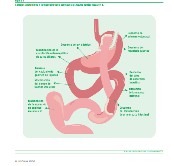 Los cambios farmacocinéticos luego de la CB y la pérdida de peso dependerán, en gran medida del tipo de cirugía rea- lizada, el grado de reducción en el IMC y las propiedades del medicamento. Existe evidencia que indica que la absorción de fármacos podría disminuir luego de la cirugía. Este cambio podría explicarse por la restricción gástrica causada por la disminución de la superficie estomacal, con la consecuente