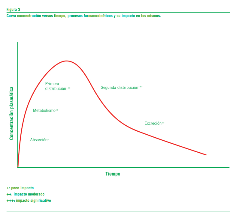 En la figura 3 se observa una curva de concentración plas- mática en función del tiempo de un PA administrado por VO y la influencia de la obesidad en los procesos farmacocinéticos.
