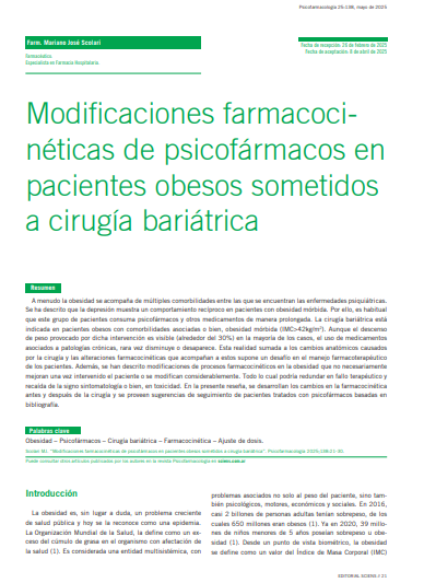 Scolari MJ. “Modificaciones farmacocinéticas de psicofármacos en pacientes obesos sometidos a cirugía bariátrica”. Psicofarmacología 2025;138:21-30. Puede consultar otros artículos publicados por los autores en la revista Psicofarmacología en sciens.com.ar