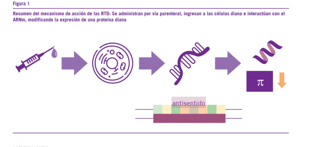 De una forma similar a los anticuerpos monoclonales, las RTDs comparten un mecanismo de acción general, con di- ferencias en los efectos farmacológicos según la diana a la cual estén dirigidos. Estas drogas interactúan con el ADN o el ARNm celular y modifican la síntesis de proteínas. Dentro de esta familia de fármacos, encontramos dos subgrupos im- portantes: los Oligonucleótidos Antisentido (ASO, antisense oligonucleotides) y los ARN pequeños de interferencia (siRNA small interfering RNA).