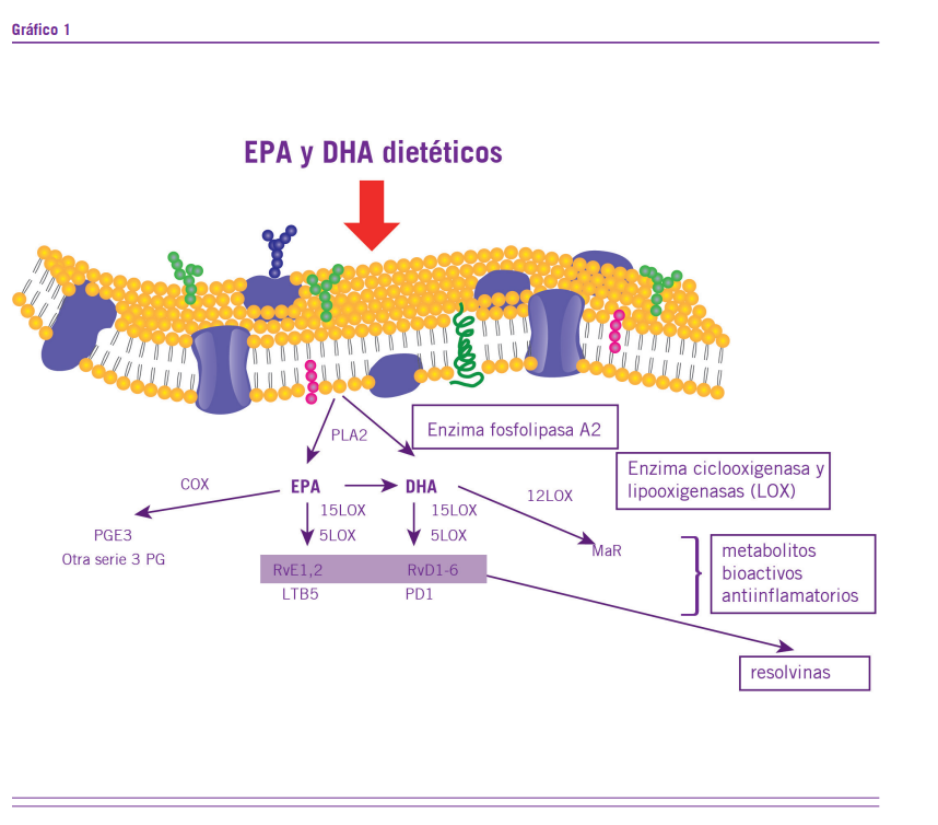 Las enzimas dependientes de la polimerasa tienen propie- dades antiinflamatorias puesto mejoran los niveles tisulares de DHA y EPA, así como sus metabolitos antiinflamatorios (Kiss et al., 2015; Curtin et al., 2020). Los niveles tisulares de DHA y EPA se logran mediante la incorporación de éstos a os fosfolípidos de membrana con un proceso que es dosis y tiempo-dependiente, aunque la incorporación de EPA ocurre más rápido (Calder, 2013). Así, se genera un efecto antiinfla- matorio del EPA y DHA que está asociado con la disminución