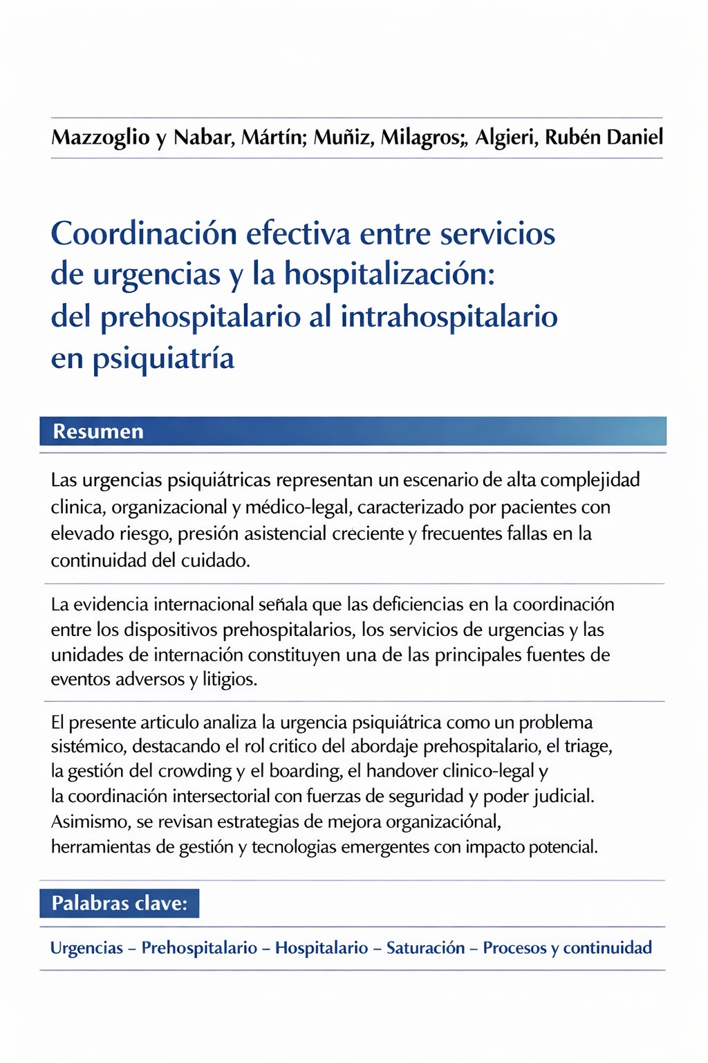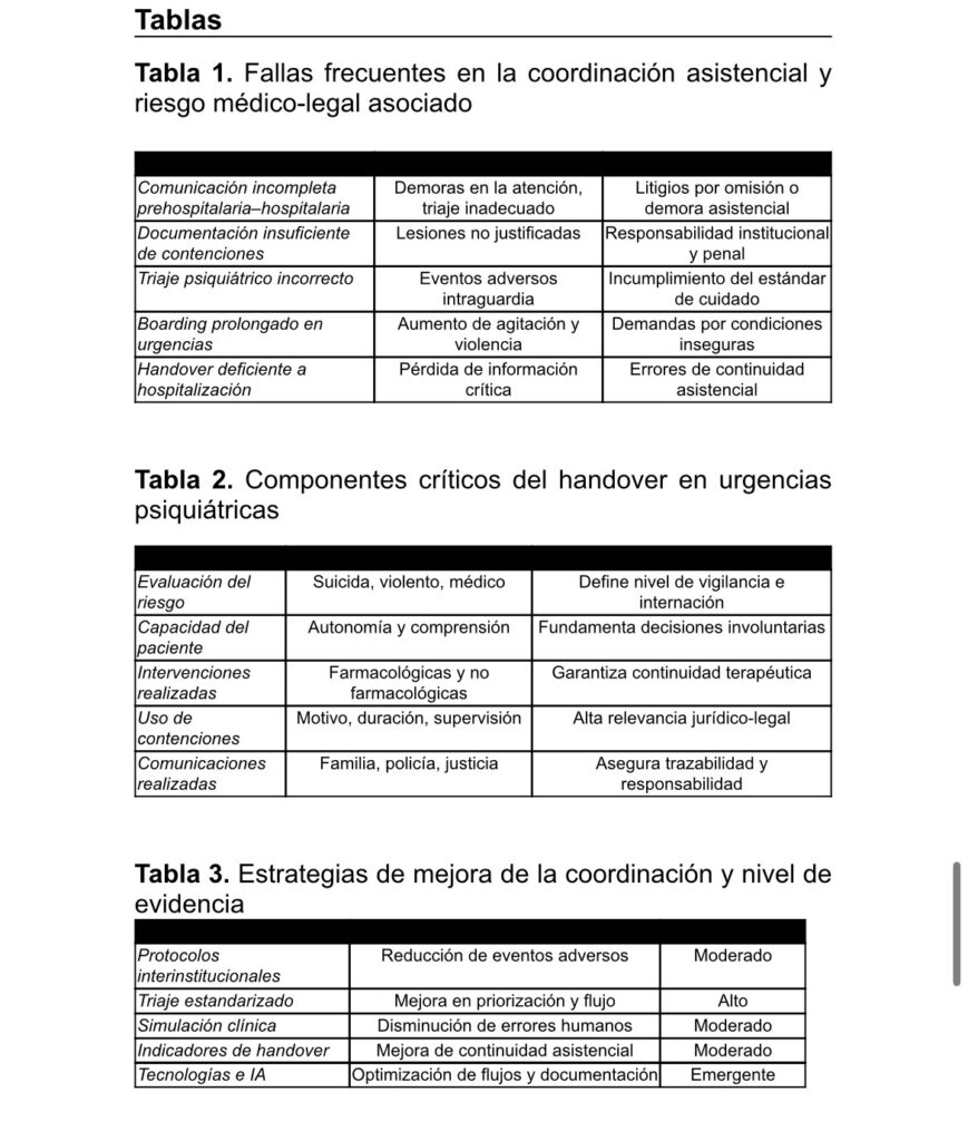 Urgencias psiquiátricas · Riesgo clínico · Continuidad del cuidado · Triaje · Crowding · Handover clínico-legal · Coordinación intersectorial
