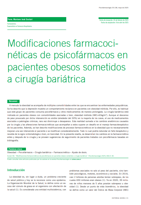 Scolari MJ. “Modificaciones farmacocinéticas de psicofármacos en pacientes obesos sometidos a cirugía bariátrica”. Psicofarmacología 2025;138:21-30. Puede consultar otros artículos publicados por los autores en la revista Psicofarmacología en sciens.com.ar