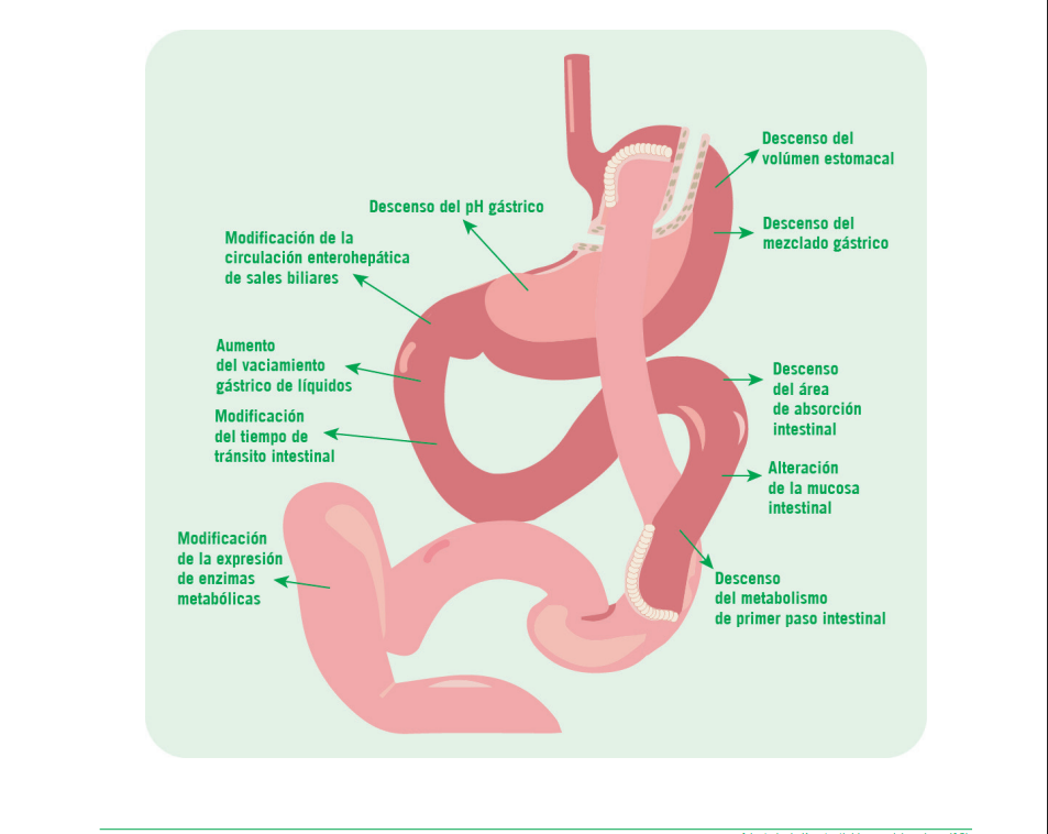 Los cambios farmacocinéticos luego de la CB y la pérdida de peso dependerán, en gran medida del tipo de cirugía rea- lizada, el grado de reducción en el IMC y las propiedades del medicamento. Existe evidencia que indica que la absorción de fármacos podría disminuir luego de la cirugía. Este cambio podría explicarse por la restricción gástrica causada por la disminución de la superficie estomacal, con la consecuente