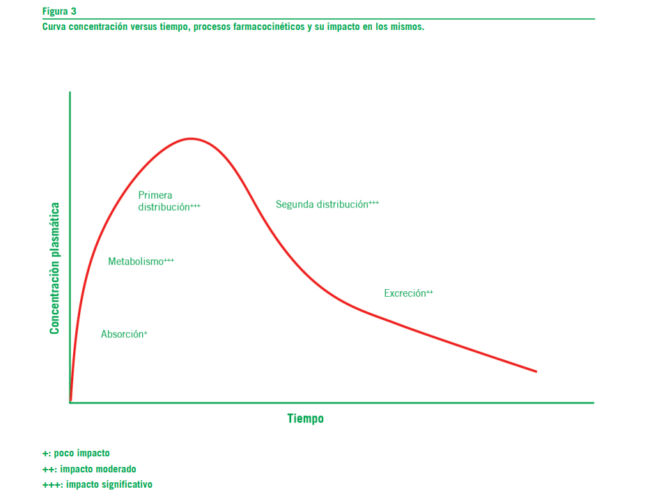 En la figura 3 se observa una curva de concentración plas- mática en función del tiempo de un PA administrado por VO y la influencia de la obesidad en los procesos farmacocinéticos.