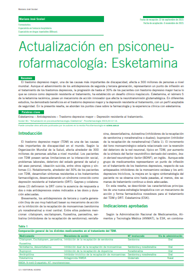 Nov 6, 2023 Biblioteca Mariano José Scolari Actualización en psiconeurofarmacología: Esketamina Resumen El trastorno depresivo mayor, una de las causas.. Read more