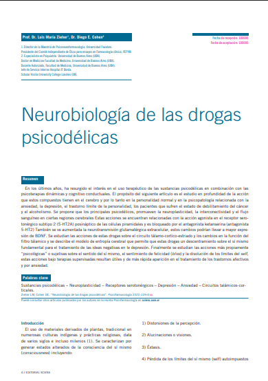 Zieher LM, Cohen DE. “Neurobiología de las drogas psicodélicas”. Psicofarmacología 2022;129:4-xx. Puede consultar otros artículos publicados por los autores en la revista Psicofarmacología en sciens.com.ar