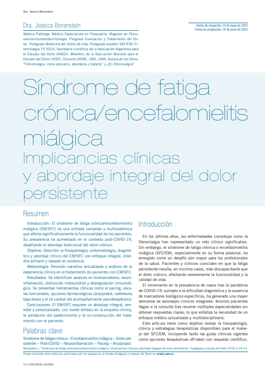 Borenstein J. “Síndrome de fatiga crónica/encefalomielitis miálgica. Implicancias clínicas y abordaje integral del dolor persistente”. Analgesia y manejo del Dolor 2025;2:14-22. Puede consultar otros artículos publicados por los autores en la revista Analgesia y manejo del Dolor en sciens.com.ar
