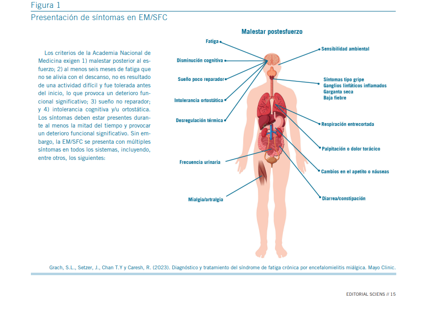 Metodología: Revisión narrativa actualizada y análisis de la experiencia clínica en el tratamiento de pacientes con EM/SFC. Resultados: Se identifican avances en biomarcadores, neuro- inflamación, disfunción mitocondrial y desregulación inmunológica. Se presentan herramientas clínicas como el pacing, esca- las funcionales, opciones farmacológicas (aripiprazol, naltrexona baja dosis) y el rol central del acompañamiento psicoterapéutico. Conclusiones: El EM/SFC requiere un abordaje integral, sen- sible y personalizado, con fuerte énfasis en la empatía clínica, la validación del padecimiento y la co-construcción del trata-