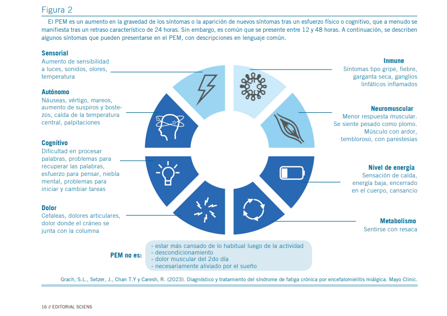 El PEM se considera un síntoma patognomónico de EM/SFC. Consiste en una exacerbación de los síntomas habituales –o aparición de nuevos síntomas– tras una actividad física, cognitiva o sensorial. Esta respuesta suele presentarse con un retraso característico de entre 12 y 48 horas y puede durar días, semanas o incluso meses hasta la recuperación funcional (1, 5, 8).